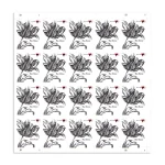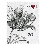 Jeanne Greco designed the Vintage Tulip stamp using drawings from engraved plates made by Maria Sibylla Merian (1647-1717), a naturalist artist.? Greco added a small, dark red heart for a touch of color.? This stamp was printed using engraving, unlike most modern stamps that are lithographed.