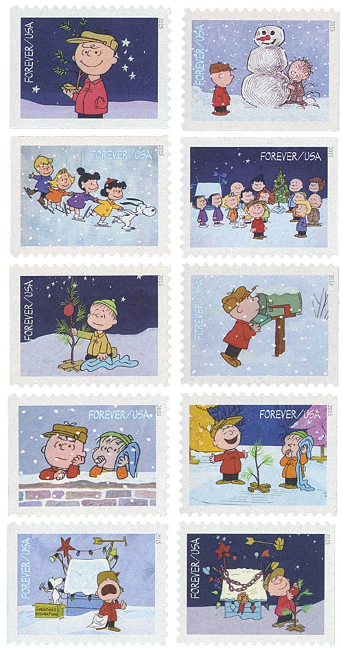 Each of the Charlie Brown Christmas Stamps features a still taken from?A Charlie Brown Christmas.??Art director Antonio Alcal?? designed the Stamps.