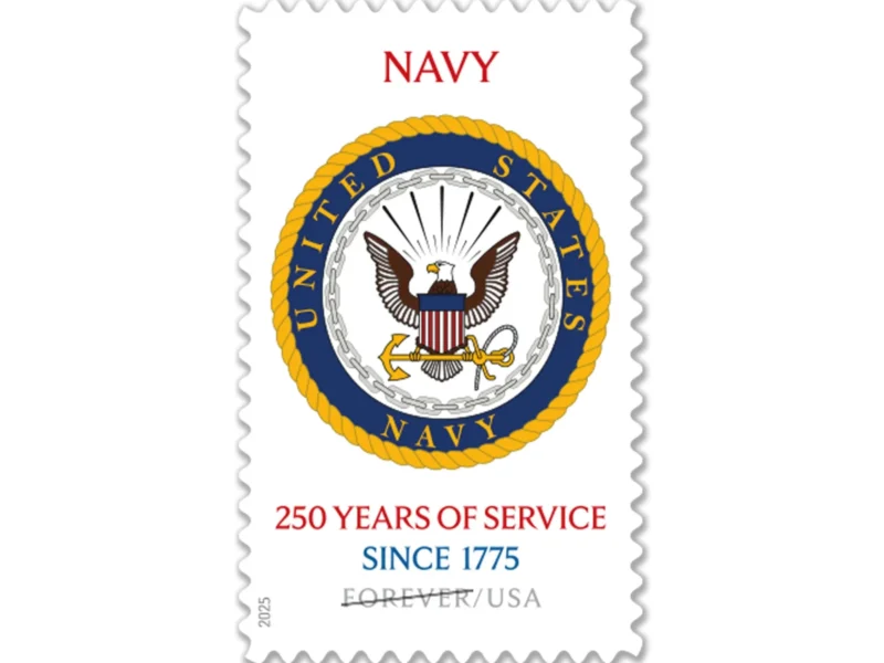 The design features the Navy’s emblem set against a clean white background, accompanied by the inscriptions “250 YEARS OF SERVICE,” “SINCE 1775,” and “FOREVER/USA.” Created by USPS art director Antonio Alcalá, the stamp reflects the Navy’s enduring legacy of honor, courage, and commitment.
