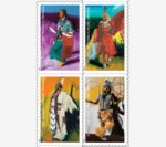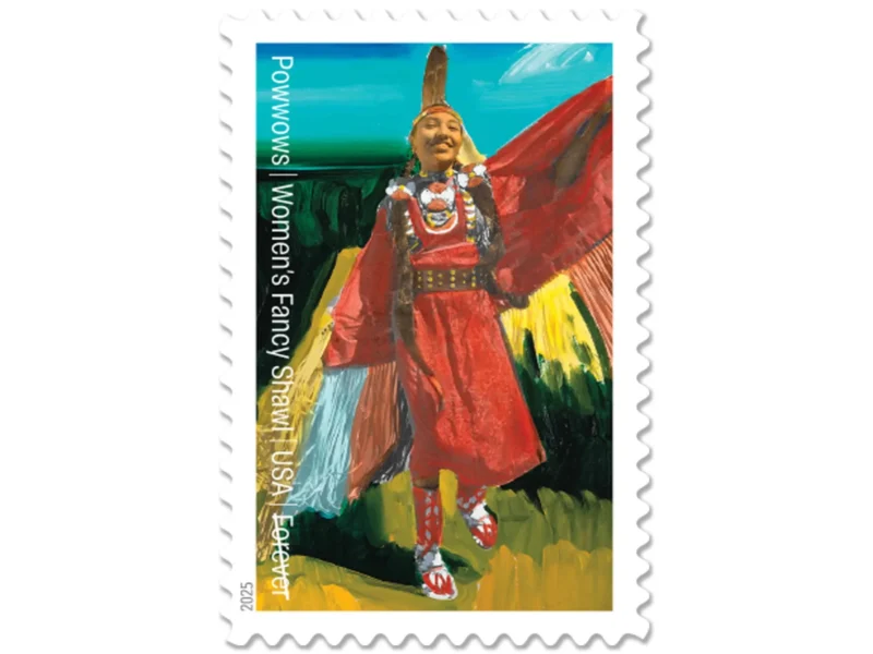 Four new stamps in a pane of 20 showcase original paintings of four Native American powwow dancers by Cochiti Pueblo artist Mateo Romero. The dances featured are Crow Hop, Women’s Traditional, Women’s Fancy Shawl, and Men’s Hoop.