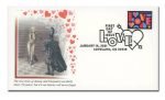 The stamp art features a lighthearted and colorful digital illustration with the word ??LOVE?? and three large hearts shown in an unconventional palette of color duos, strikingly set against a dark blue background.