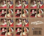The sheet features a Haddon Sundblom painting, originally published in a 1963 Coca-Cola ad.? It’s an iconic scene of Santa visiting a home on Christmas Eve.? It includes one semi-jumbo version of one of the four special-sized Stamps included in the Sparkling Holidays set.