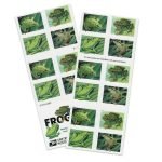 Digital illustrations of four North American frogs grace these new Stamps: the Pacific tree frog, the northern leopard frog, the American green tree frog, and the squirrel tree frog. Working with a primarily green color palette, the artist captured the essence of each animal with enough important defining features to make each recognizable.